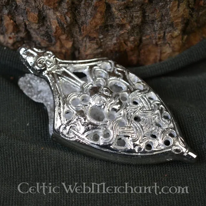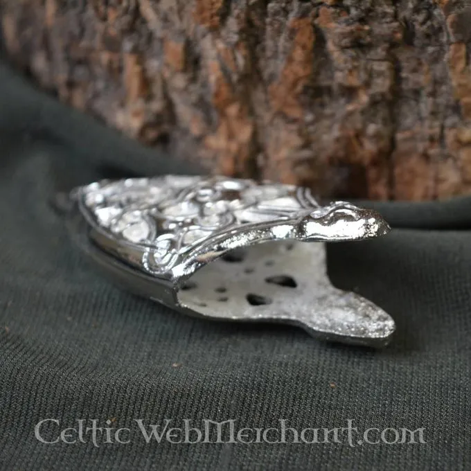 This scabbard chape is based on originals from the 10th-11th century AD. The chape is made in the Ringerike style. It can easily be fastened on the scabbard. The chape is made of silvered brass.