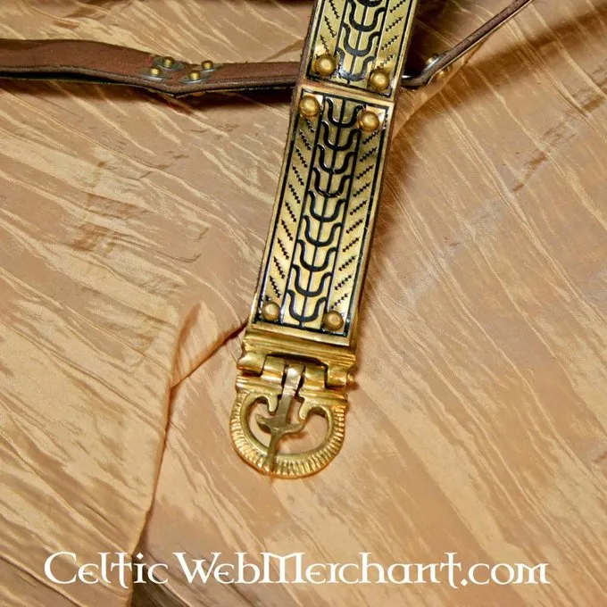 This is a reconstruction of a Roman legionary belt, the cingulum militare, as it was worn in the 1st century AD. The belt consists of sturdy, light brown leather and is beaten with thin brass plates. The length of the belt is 120 cm and it has an apron belt of 35 cm.