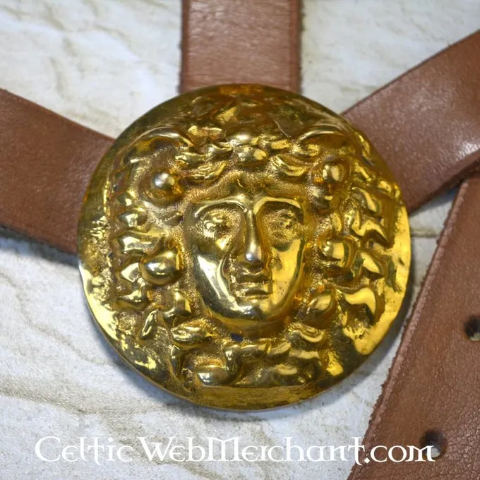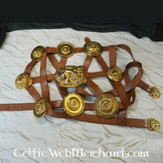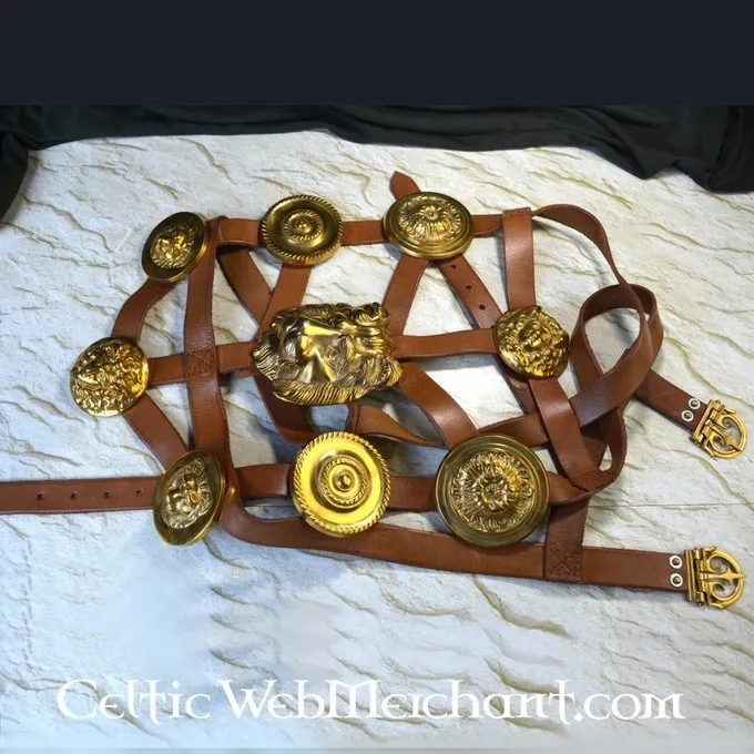 This complete set of phallerae is based on several originals. Phallerae were ‘medals’ earned by the centurio for outstanding achievements. The centurion wore these phallerae around the body. Originally these trophies, that often contain a depiction of a face, from the Celtic tradition. Celtic warriors beheaded their enemies and took the heads as trophies.
