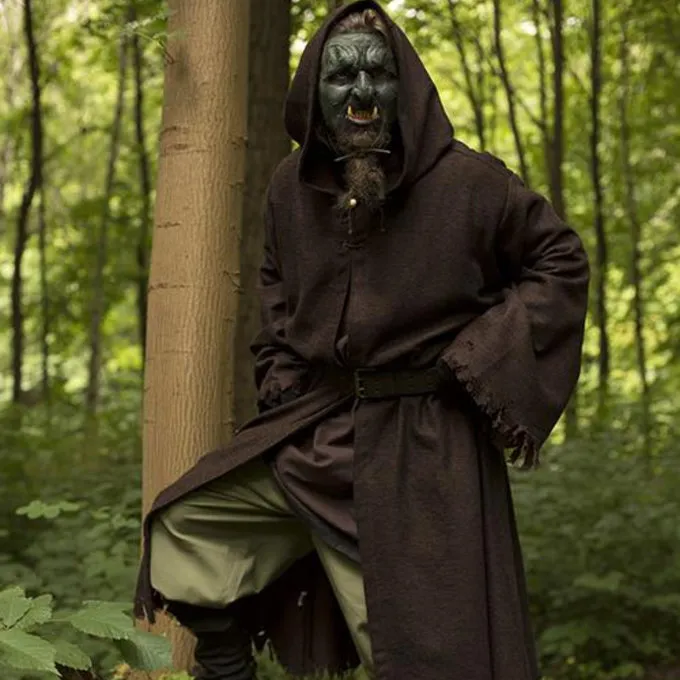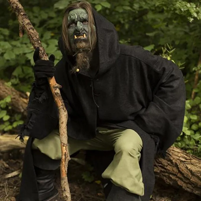Traditionally, robes were worn in religious settings, for example by monks and priests. In traditional fantasy literature, this has become the garment of magical characters. This robe is designed to look worn and frayed. It is made of textured cotton, which looks like a rough jute-like fabric, and is frayed on all edges. If you are LARPing an orc, troll or other monsterly creature or outcast, this is a perfect garment to wear over your costume. Due to the rough finish and the hood that you can wear over the head, the robe gives you a creepy and evil look. This makes it also extremely suitable for Halloween and theater. The cloak is suitable for outdoor wear in all seasons and protects against rain and cold. You can fasten the robe to the neck with a leather lace and a leather strip.